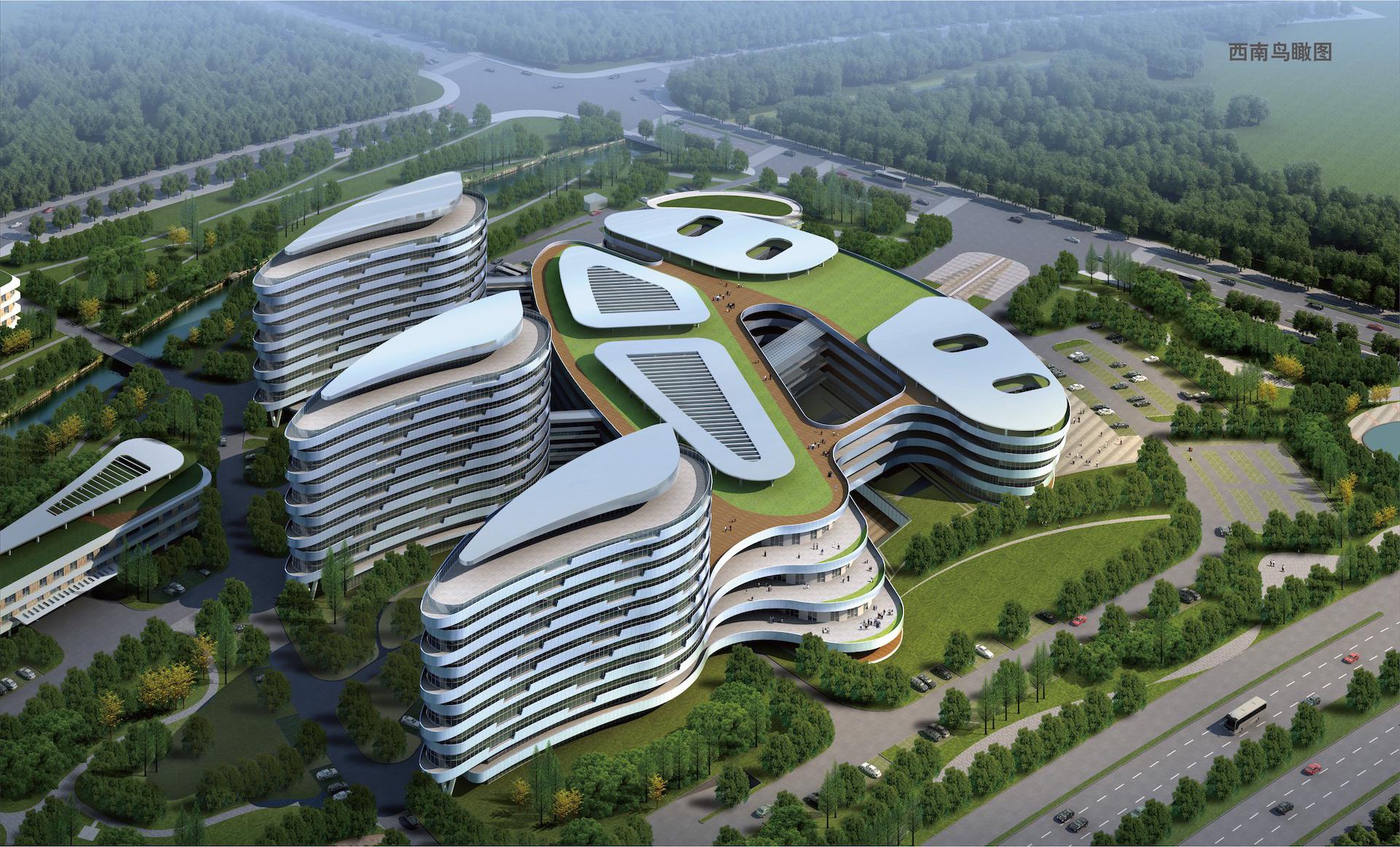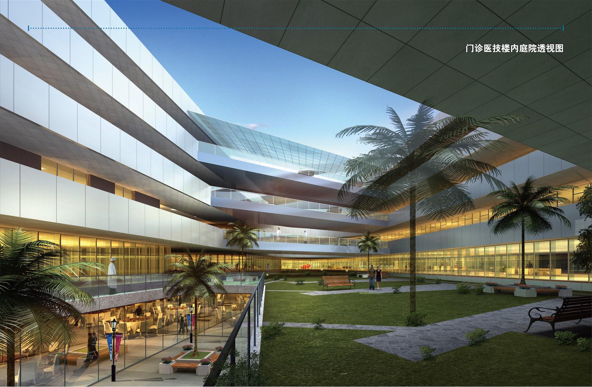 基地内部有一条水系。水系将基地划分为南北两部分,医疗功能主体建筑位于南侧,主入口设置在东侧道路上。门诊、医技、住院功能由东向西依次展开。项目大量采用极具地域性特征的设计元素:门诊医技楼设置内庭院和敞廊,内庭院增加采光通风,敞廊为我国西南部地区常采用的建筑元素;医技楼南侧建筑形体层层退进,作为观景平台和绿化屋顶。