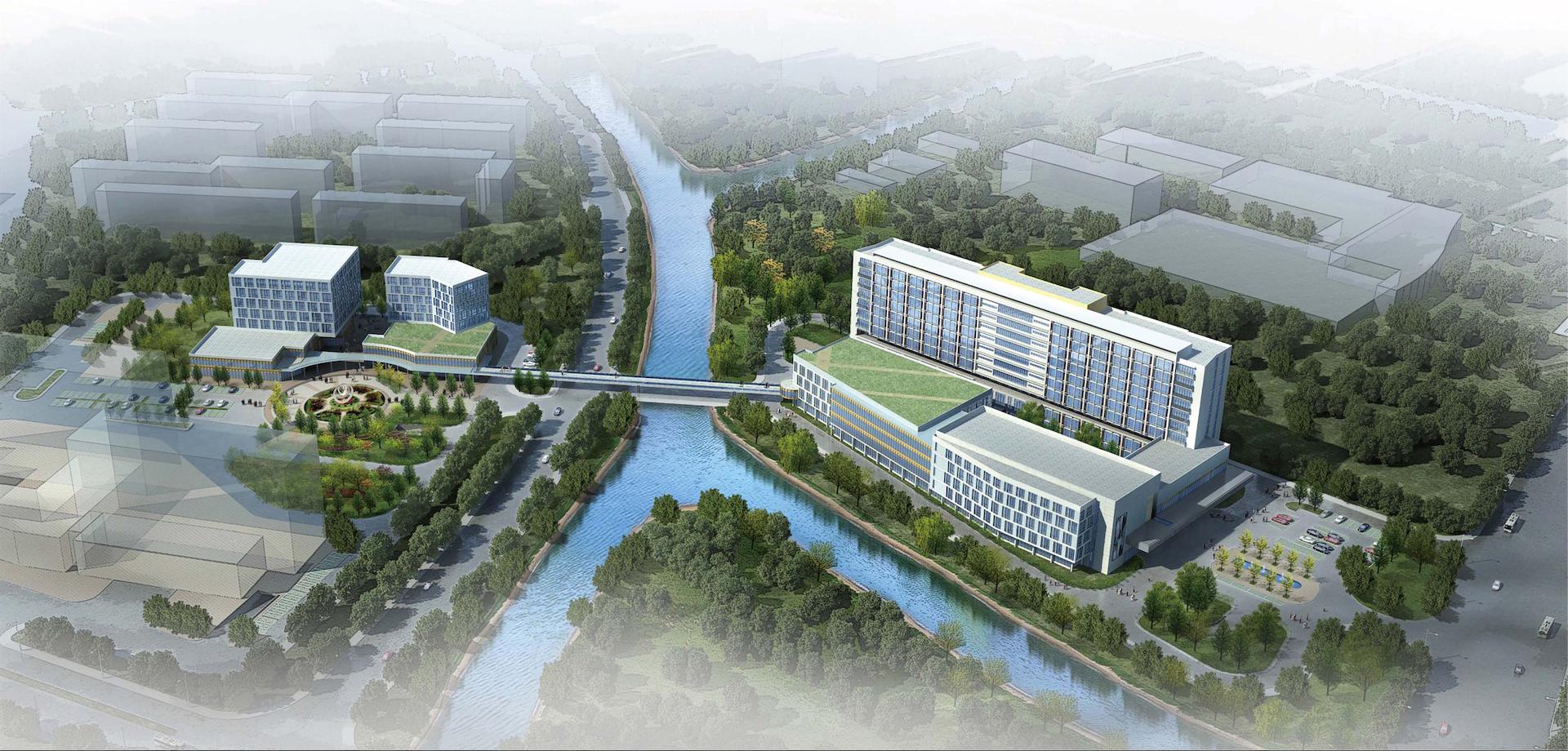 院区分东西两个地块,东区包括医疗综合楼及附属建筑,西区包括行政及生活保障楼、科研楼和动物实验楼。