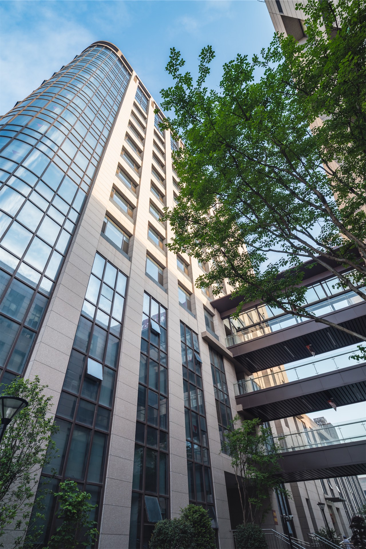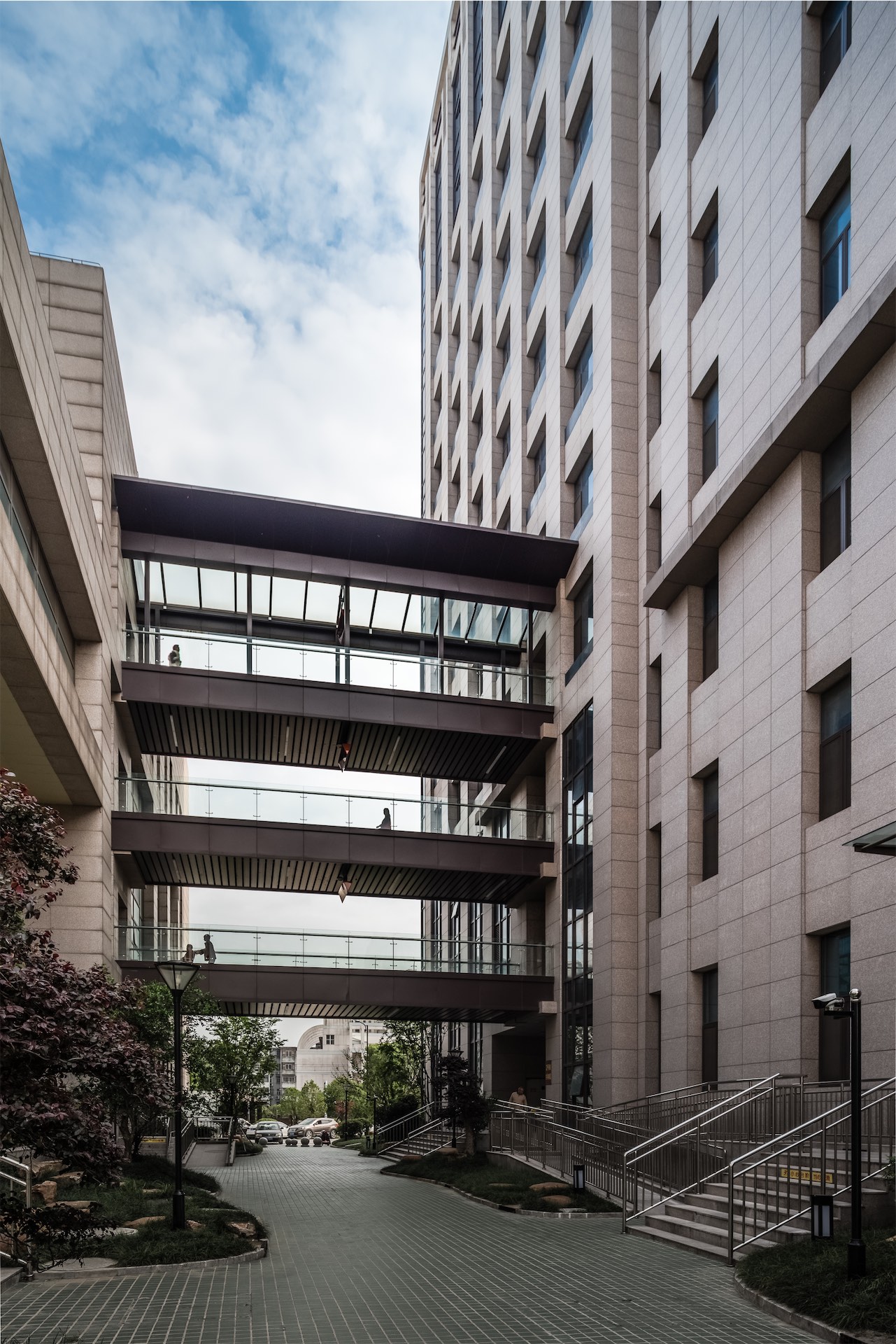 建筑造型设计结充分考虑沿四望亭路与维扬路的空间轮廓和城市形象,形成统一有序、层次丰富的空间界面,体现医院建筑独特的建筑个性和明显的标识性。立面采用统一的模数与墙面划分,产生明确严谨的规律。并采用大块面的虚实对比手法,创造大气而又整体的形象,强调建筑的现代感及“人性化”医院的设计理念。以高起点、高标准、高眼界来为该建筑定位,打造该地区内具有标志性和时代感的建筑形象。